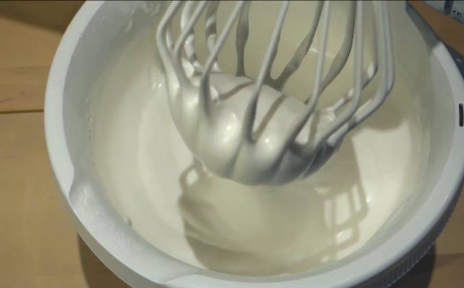 2. После этого добавьте 1/3 ч.л. лимонного сока, либо уксуса. Когда пена начала крепко стоять на венчике, нужно прекратить взбивать. У меня весь процесс занял примерно 10-15 минут. Вы можете оставить крем таким, как есть, либо добавить в него растопленный шоколад. Если хотите сохранить этот мраморный узор, не перемешивайте слишком долго. Мусс я тоже разложила по стаканчикам.
