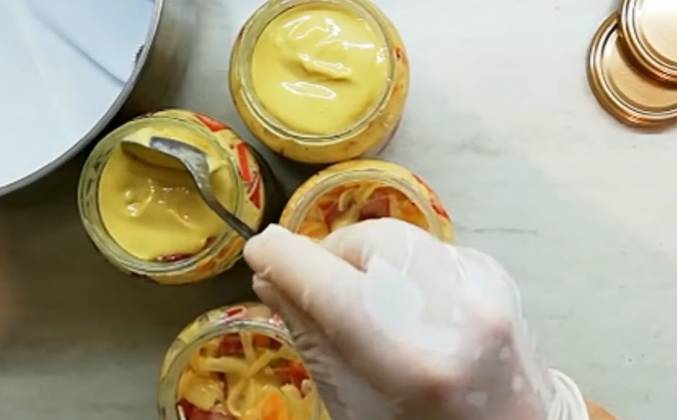 3. В конце кладем ложку с горячей горчицей или даже больше, по желанию. соус готов и выглядит как майонез собираем все овощи в одну миску. Смешиваем их. Затем добавьте горчичный соус, но оставьте на конец 4 столовые ложки соуса. гомогенизируйте смесь ингредиентов. Затем кладем смесь в банки. Прижимаем хорошо, чтобы не осталось пузырьков воздуха. Затем полейте столовой ложкой соуса. Закрываем каждую банку крышкой. Банки поставим в высокую кастрюлю, поставим на полотенце для кипячения. Налейте воду на 2/3 высоты банок и кипятите 25 минут. Хранить в прохладном месте. Перец в горчичном соусе.Видео рецепт ютуб ниже 👇