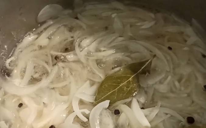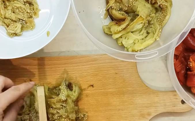 2. Затем в маринад кладем лук. Держите на среднем огне, пока лук не станет полупрозрачным (около 15 минут). Нарезать спелый баклажан. Нарезать перец более мелкими полосками. Собираем все ингредиенты в миску и хорошо перемешиваем.