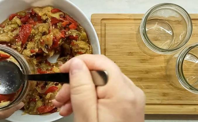 3. Готовим банки и наполняем их салатом ... Наполните все банки, затем налейте немного масла. Закрываем банки крышками. Сохраняйте прохладу на зиму. Салат из баклажанов с запеченным перцем и маринованным лукомВидео рецепт ютуб ниже 👇