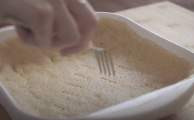 2. Тесто мягкое, поэтому придать нужную форму просто. Немного потыкаем тесто вилкой Чтобы не трескалось и не поднималось. Отправляем основу в духовку. Филе режим кубиками среднего размера Нарезанное филе отвариваем до готовности Мне удобнее всего доставать мясо шумовкой, чтобы не было лишней жидкости. Бульон пойдёт на суп.