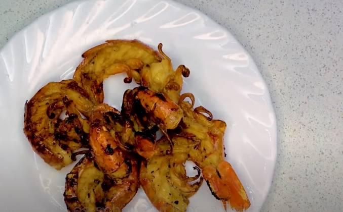 2. На разогретой сковороде 50 г сливочного масла. Обжарьте креветки. Кокс 150 мл.
