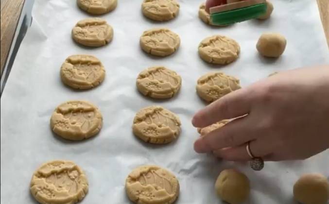 2. Замесить тесто. Если тесто слишком мягкое, можно отправить в холодильник на 30-40 мин. Далее формируем шарики весом по 20 г. Перекладываем на противень и ставим штамп с помощью печати.