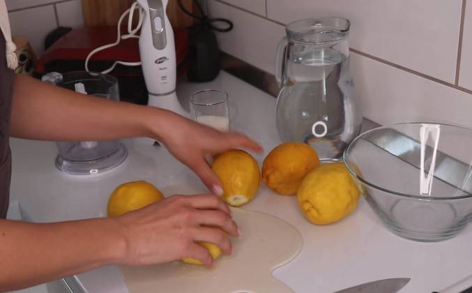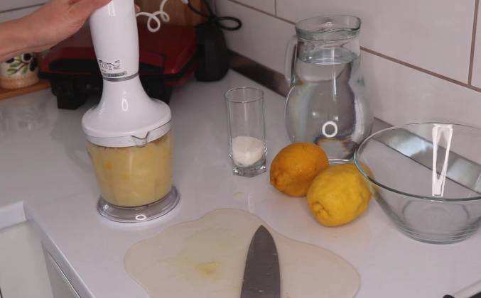 2. Я нарезаю лимоны вот так и кладу их в блендер. Вот столько достаточно пока. Добавляю сахар. Закрываю. Добавляю остальные кусочки И довожу до такой консистенции. Что мы делаем дальше? Берем сито и сливаем в него. Я даю стечь вот таким образом, и проделываю тоже самое с оставшымися лимонами. Сок стек.