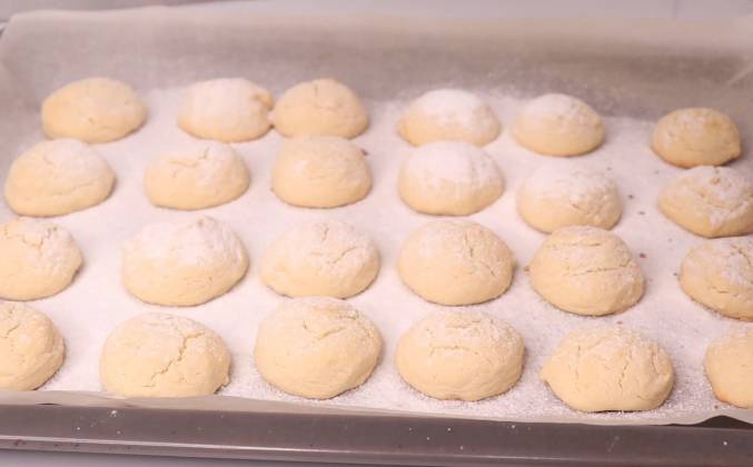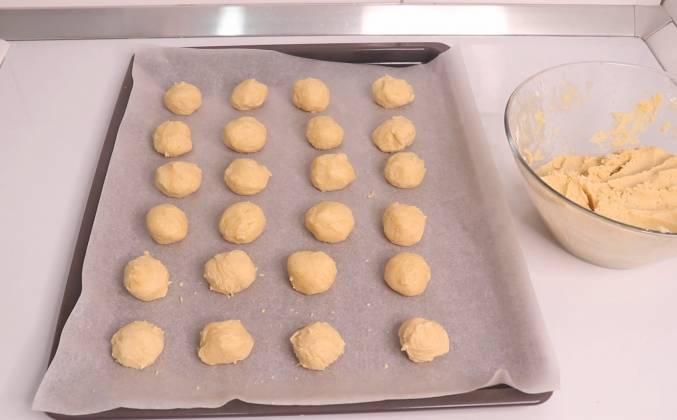 2. Вот такое получилось красивое мягкое тесто. Делаем шарики. Вы можете сделать любой размер, какой захотите. Как маленькие, так и большие шарики. Я подготовила противень заранее. Кладу бумагу для выпечки и продолжаю делать вот такие кругляши. Мне трудно сказать, сколько печенья получится из этого количества теста. Поскольку количество печенья варьируется от размера шариков, которые вы делаете, но если делать такого размера может получится 30-40 печенюшек.