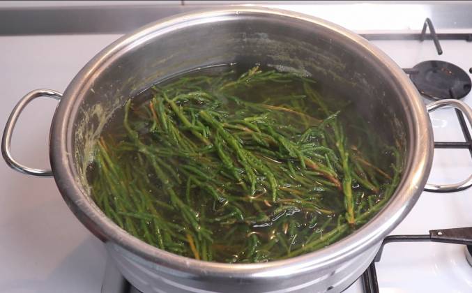 2. После того, как вода закипит, добавлю морской укроп И буду варить 15-20 минут. Вода закипела, теперь давайте добавим в нее морской укроп. Накрываю крышкой и готовлю 15-20 минут. Готовлю очень простой соус. Беру оливковое масло. Выжимаю в него сок 1 лимона. Добавляю щепотку соли. Не добавляйте слишком много соли, потому что морской укроп сам по себе соленый. И взбиваю. Отставляю в сторону пока что. По желанию можно добавить чеснок, уксус или гранатовый сироп. Если, конечно, вам нравится. Прошло минут 15-20. Давайте