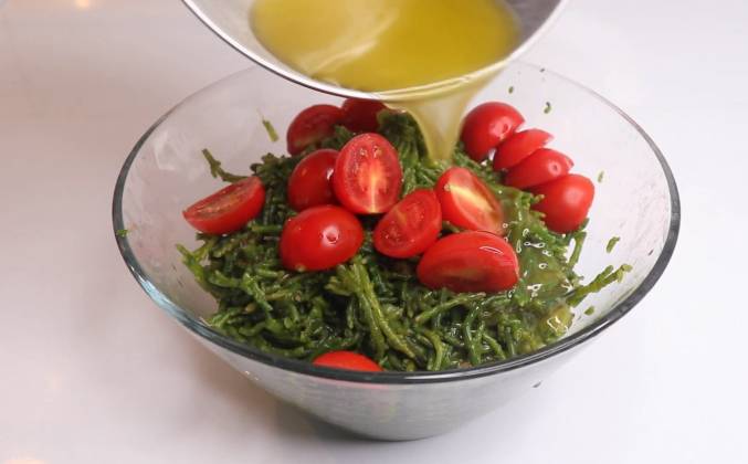 3. Давайте проверим морской укроп готов или нет. Горячий. Будем осторожны, чтобы не обжечь пальцы. Нам нужно достать одну из веточек. И сделать вот так, если легко отделяется, значит готов. Я процедила, и промыла в холодной воде. Теперь нужно вот так отделить от веток. Если хотите, можете использовать все, половину можно добавить в салат, а половину положить в морозильную камеру. Я буду использовать все сейчас. Помидоры черри разрезаю пополам и кладу вот так. Поливаю соусом. И тщательно перемешиваю. Получился очень красивый, полезный салат-закуска. Имеет насыщенный морской вкус . Приятного аппетита!Видео рецепт ютуб ниже 👇