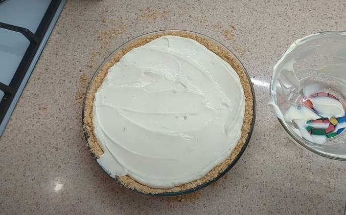 3. И теперь нам нужно вдавливающими движениями сделать небольшое углубление под наш крем, отправляем в холодильник на полчаса, готовый крем кладем на печенье и разравниваем его. В конце нужно немного постучать формой об стол чтобы вышел лишний воздух и не было пузырьков. В духовке на противень выливаем 1 стакан воды и низ нашей формы для чизкейка заворачиваем фольгу, чтобы он хорошенько пропёкся, ставим в духовку на 180 градусов на час, достаем из духовки, даём остыть и отправляем в холодильник на 10-12 часов.Видео рецепт ютуб ниже 👇