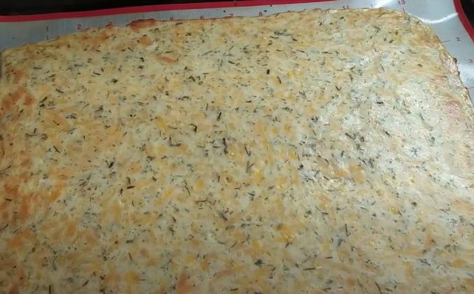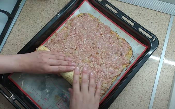 2. Тонким слоем равномерно распределяем заготовку для сырного коржа, убираем в духовку разогретую до 180 градусов на 10-12 минут, одну головку лука поджариваем до золотистого цвета, фарша понадобится, 500 граммов фарша солим перчим и добавляем в него лук, перемешиваем.