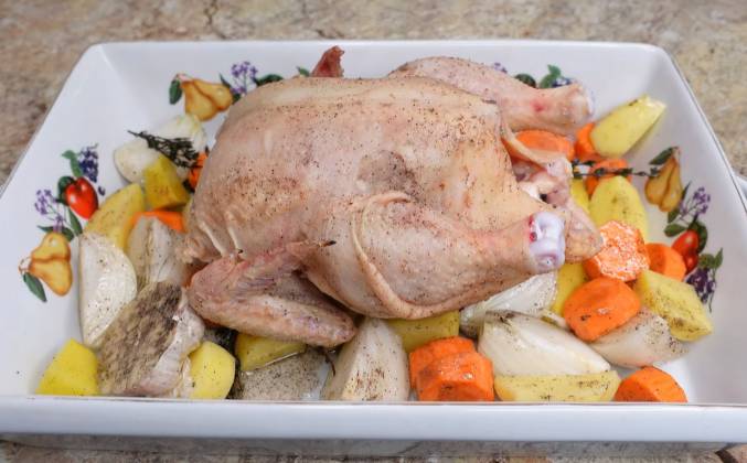 Как приготовить курицу в духовке целиком рецепт. Я купила на рынке домашнюю курочку и сегодня решила приготовить ее в духовке. Поэтому сегодня у нас будет сочная домашняя курочка в духовке со свежим тимьяном и хрустящей корочкой. Ингредиенты, которые я использую для рецепта: у меня 1 кг 200 грамм домашней курицы. Около 400 г картофеля, 1 большая морковь, 2 средних луковицы, 1 головка чеснока, 1 лимон, 6-7 веточек тимьяна, 50 г топленого масла, соль, черный перец и оливковое масло.