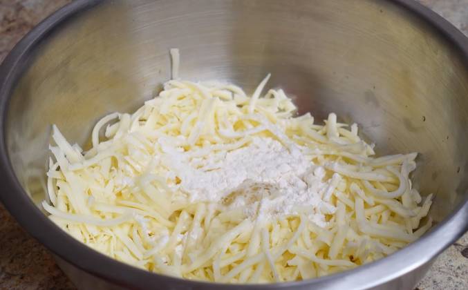 2. Когда тесто станет эластичным, я добавляю немного подсолнечного масла. И продолжаю вымешивать. Вот такое замечательное эластичное тесто получилось. Берем подготовленную заранее большую миску, дно смазиваю оставшимся маслом. Теперь кладу в нее приготовленное тесто. Смазываю тесто сверху небольшим количеством масла. После этого хорошо прикрываю стрейч-плёнкой или полотенцем и оставляю подниматся в среднем на 40-60 минут в теплом месте. Теперь приготовим сырную начинку. Первым делом натираю сыр. Проверьте на вкус сыр. Если он недостаточно соленый, можно добавить немного соли. Теперь добавляю один яичный белок. Половина столовой ложки муки, 2-3 столовые ложки воды. Смешиваю с помощью лопатки. Вот так. Тесто замечательно поднялось. Перекладываю на поверхность. И расскатываю.
