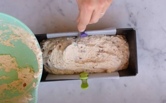3. С помощью ложки, замесите тесто до однородного состояния. Все, наше тесто готово для выпекания. Разогрейте духовку до 200 гр. Застелите форму (размер 25 см.) смазанную маслом, пергаментом, чтобы хлеб не прилип и из формы его можно было легко достать. Перелейте тесто в форму, украсьте овсяными хлопьями или семенами мака и отправьте в духовку на 50 мин.