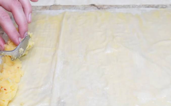 2.  Вот такое пюре должно получится. Когда я варила картофель, я добавляла в воду соль, но вы все равно можете добавить соль, если почувствуете что на вкус соли не хватает . Теперь добавляю масло и перемешиваю. И оставляю остывать. Теперь мы можем приступить к самому интересному. Я беру лист теста и смазываю приготовленным соусом. Вот так. Сверху кладу еще один лист теста фило. И снова смазиваю соусом. На край выкладываю картофельную начинку. Вот так достаточно и скатываю в рулетик. Почти готово. Выклыдываю в форму, предварительно смазав форму для выпекания маслом.