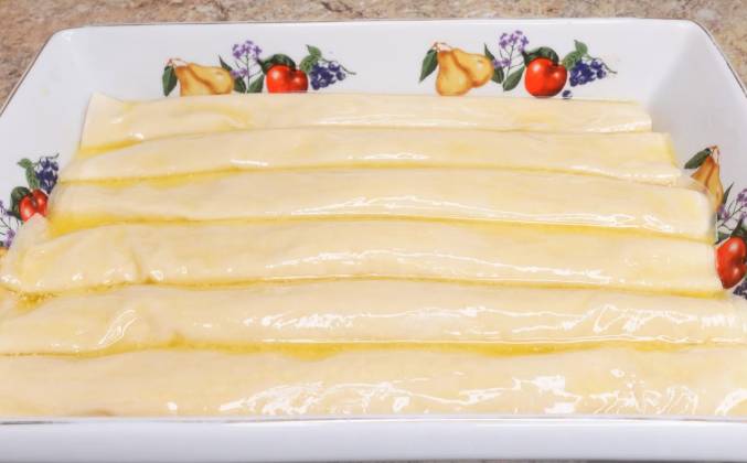 2.  Вот такое пюре должно получится. Когда я варила картофель, я добавляла в воду соль, но вы все равно можете добавить соль, если почувствуете что на вкус соли не хватает . Теперь добавляю масло и перемешиваю. И оставляю остывать. Теперь мы можем приступить к самому интересному. Я беру лист теста и смазываю приготовленным соусом. Вот так. Сверху кладу еще один лист теста фило. И снова смазиваю соусом. На край выкладываю картофельную начинку. Вот так достаточно и скатываю в рулетик. Почти готово. Выклыдываю в форму, предварительно смазав форму для выпекания маслом. 3.  Также у меня остался соус, чуть меньше половины. Смазываю оставшимся соусом бёрек сверху. Если у вас есть время, оставьте на 10-15 минут следующим образом. Если нет, то можно сразу отправлять в духовку. Я заранее выставила духовку на 180 градусов. Оставляю выпекатся в среднем на 25-30 минут. Бёрек готов. Давайте, посмотрим, как получилось :) Получилось замечательное тесто хрустящее снаружи и мягкой внутри. Всем приятного аппетита.