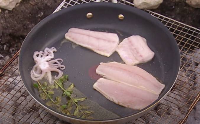 3. И оставляем все это поджариться в соусе немного. Итак, посмотрим что здесь у нас. Очень осторожно переверните рыбу. Посмотрите на этот цвет. Великолепно. Все это жарится буквально 40 секунд. Перевернем этого окуня. Щупальца положим сверху на рыбу, чтобы они не стали жесткими. То же самое сделаем с морским гребешком. Рыбу нужно готовить дольше. Кальмара тоже убираем. Поставим сковороду на огонь. А теперь я хочу взять немного укропа и тимьян, хорошо потрясем. А теперь порежем перец чили. Теперь все готово. Выкладываем на тарелку. Кожа хрустящая, прекрасные кусочки кефали, морской язык, несколько щупалец.