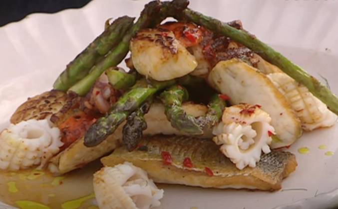 Жаренная рыба с кальмаром и спаржей на сковороде