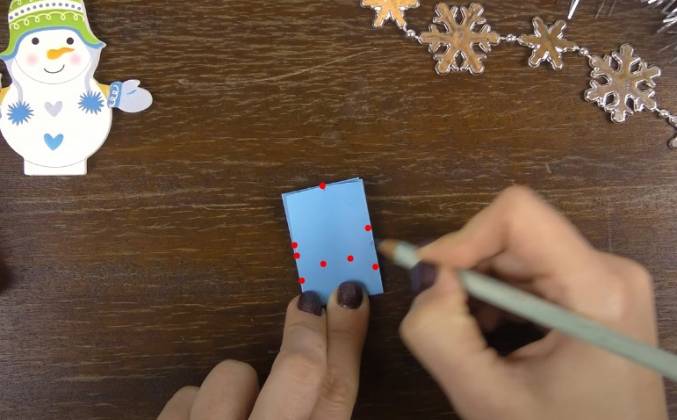 3. Аналогично проделываем с другой стороны. Складываем заготовку по вертикали пополам. Промазываем клеем, складываем и хорошо прижимаем. Даем подсохнуть. Рисуем шаблон для вырезания. Отмечаем 9 точек. Одну по центру Остальные симметрично с обеих сторон Соединяем их между собой.