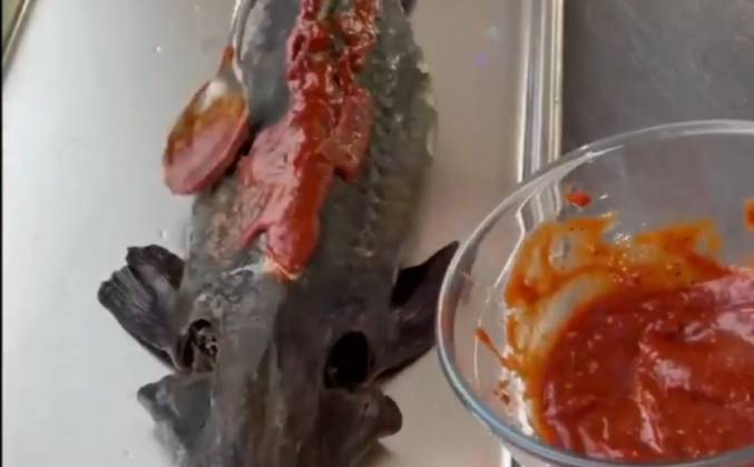 3. Смешать вилочкой все ингредиенты для маринада, обмазать им всю рыбу, оставить мариноваться на 30-60 минут. ⠀ Рыбе придать форму – аккуратно веревочкой подвязать хвост к голове. ⠀ Репчатый лук нарезать толстыми кольцами, положить на противень, сверху на лук выложить рыбу. ⠀ Запекаем в нагретой духовке 180 гр., 30 минут. Если рыба крупная, килограмма три, то 40 минут. ⠀ Обязательно к рыбе подаём лимон, на гарнир можно запечь картофель.Видео рецепт ниже 👇