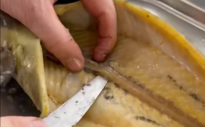 2. Удаляем жабры. И обязательно надо удалить визигу в позвоночнике, если её не удалить, во время запекания она может повылазить по бокам, порвать рыбу, и рыба может искривиться во время запекания. Как удалить визигу – сделать надрез на позвоночнике у головы, и сквозной надрез на позвоночнике у хвоста, не доходя 3 см. до хвоста. И вытягиваем пальцами визигу, это хрящик такой. Потом промыть рыбу под проточной водой, обсушить и мариновать.