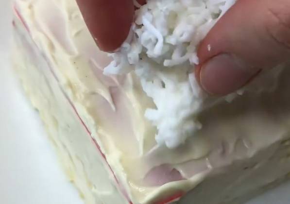 3. Смазать майонезом со всех сторон и обсыпать тёртым белком.Видео рецепт ниже 👇