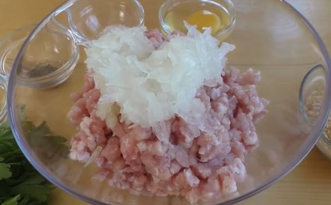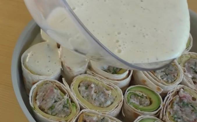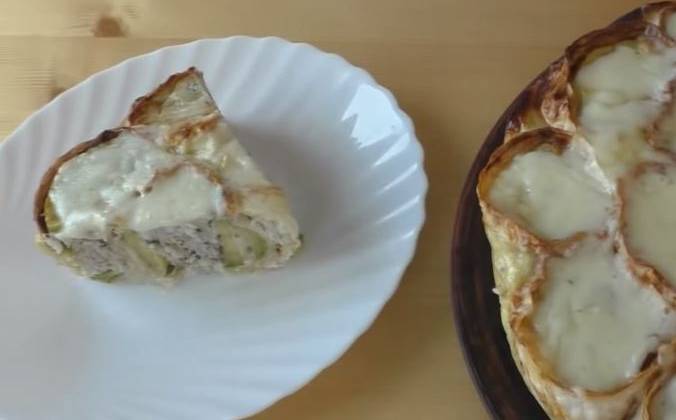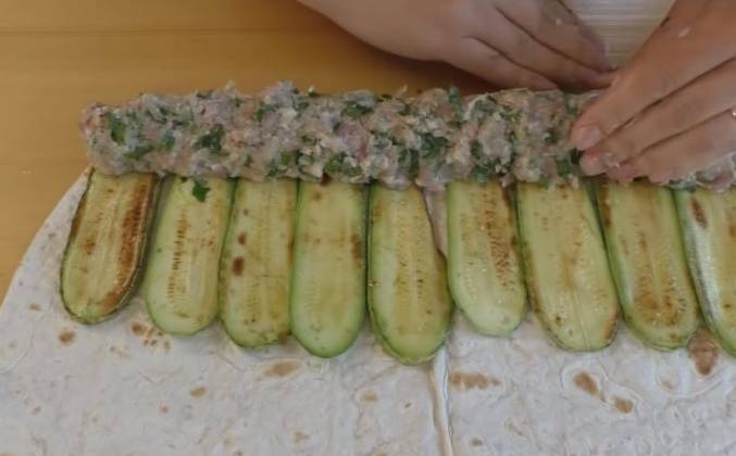 3. На край кабачков выкладываем фарш. И теперь аккуратно, но плотно сворачиваем всю эту конструкцию в рулет. Если у вас лаваш небольшой, то у вас получится 2 рулета. У меня лаваш приличный. Получился один. Для удобства я разрезаю лаваш сначала пополам. И аккуратно нарезаем рулет вот на такие шайбы. Смотрите, какая уже красота. Выставляем рулетики в форму - у меня форма 24 сантиметра. Для заливки 3 яйца соединим с солью. Помним, что у нас фарш хорошо соленый, но лаваш и кабачок не очень соленые.