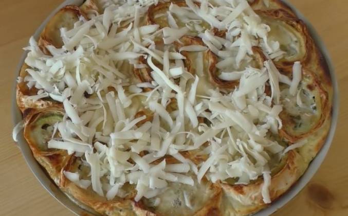 5. Мне просто хочется, чтоб сверху была такая расплавленная корочка. Поэтому я отправляю в духовку, сыра грамм 30-40, не больше. Отправлю в духовку на пару минут, чтобы он расплавился. Чудесный, ароматный пирог. Ой, друзья, очень уже хочется попробовать такую красоту. Посмотрите. Слоёный, да еще с такой начинкой - обалдеть! Зажарился, ароматный, вкусный, сытный! И главное, что - летний. Очень легко готовится - все просто без возни с тестом. Невероятно вкусно и красиво! Угощайтесь друзья! И семью свою обязательно накормите!Видео рецепт ютуб ниже 👇