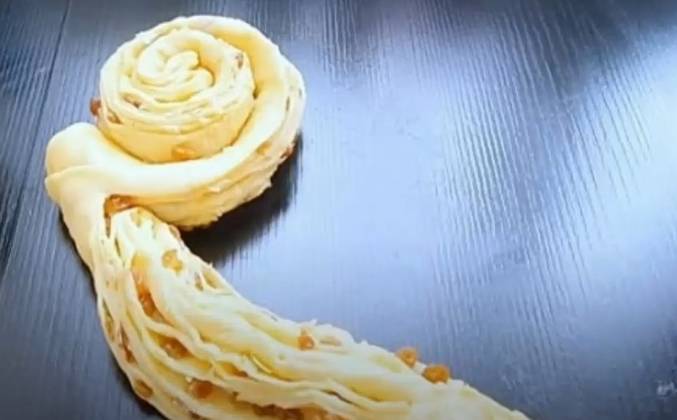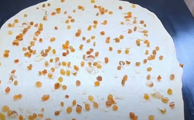 3. Поделите подошедшее тесто на две половинки. Обильно припудрите столешницу (это важно). Раскатайте первую часть в очень тонкую лепешку прямоугольной формы. Не расстраивайтесь, если не получится идеально ровных сторон. Тесто хоть и эластичное, но слишком тонкое. Обильно промажьте его сливочным маслом, сильно растапливать его не стоит, просто размягчите и обязательно хорошо смажьте края лепешки. Разбросайте по всей поверхности лепешки изюм и миндаль. Аккуратно начните скручивать лепешку в жгут. Действуйте осторожно, отлипая пальцами тесто от стола. Если вдруг оно прилипнет. Вот что в итоге у вас получится. Подобным образом сделаете лепешку из второй половинки теста. Теперь уложите первый жгут на вторую лепешку и вновь заверните в жгут. Получившийся двойной жгут разрежьте по середине по всей длине.