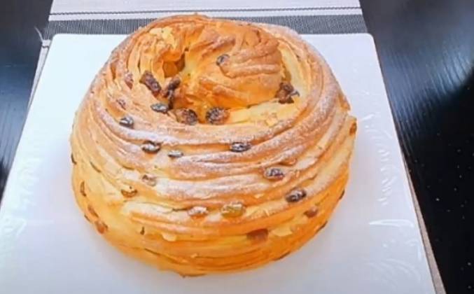 4. Один из концов до конца не разрезайте, он должен остаться целым, как у меня. Закрутите одну часть в спираль не доходя до конца, как будто плетете кружева. Второй конец закручивайте в обратную сторону, одновременно поднимая вверх, чтобы сформировать округлый кулич. Выравнивайте его руками. Смажьте форму маслом. Поместите в нее заготовку краффина, накройте полотенцем и оставьте на 20 минут. За это время кулич расправиться и немного увеличится в объеме. Поставьте форму на средний уровень духовки. Первые десять минут выпекайте кулич краффин при 200 градусов. Лучше установить форму не на противень, а на решетку. Затем сбавьте температуру до 170 градусов. Установите таймер на 40 минут. Готовность проверяйте, как обычно, длинной палочкой. Если увидите что вверх начал гореть, прикройте его фольгой. Готовый кулич краффин оставьте минут на 10 постоять на столе. Затем красиво припудрите или украсьте глазурью и дайте окончательно остыть. Вот такой кружевной пасхальный кулич краффин у нас получился.Видео рецепт ютуб ниже 👇