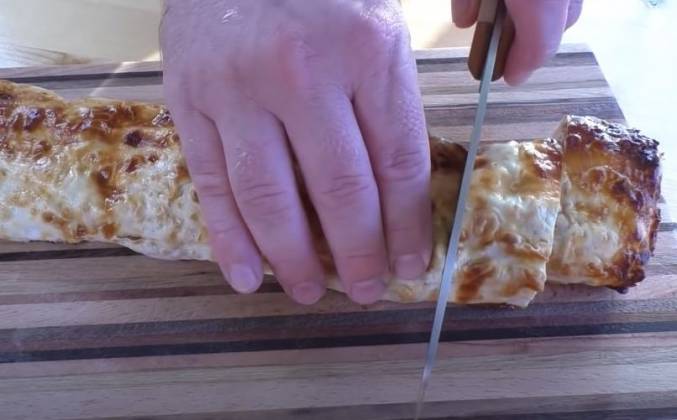 3. Начинаем плотненько заворачивать рулет. Духовку я включил на 200 градусов, при этой температуре и будем выпекать. Теперь в 3 столовые ложки сметаны добавляем пару ложек сахара, сюда же одно яйцо и все хорошо-хорошо перемешиваем. Обильно промазываем сметаной с яйцом и запекаем до золотистости.Видео рецепт ютуб ниже 👇