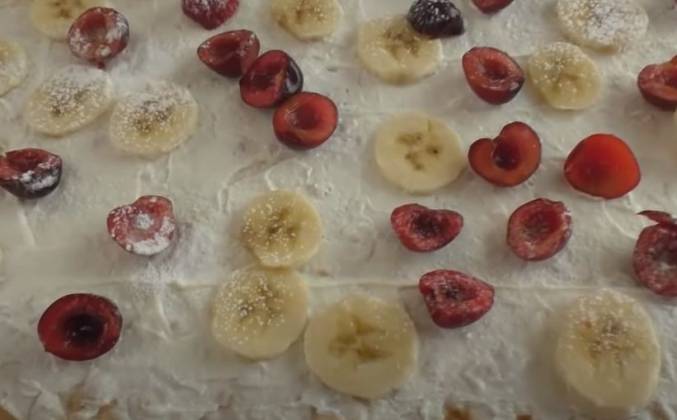 2. Хотя, друзья, можно и перетереть через сито - тоже будет отлично. Ну, конечно, через сито - это очень трудоемко, все-таки миксером раз-два и готово. Творожную массу распределяем на лаваше, стараемся сделать это равномерно, чтобы в каждом кусочке у нас был сладкий творог. Этого количества начинки хватит на два рулета. То есть для приготовление нам понадобится два листа лаваша. Распределяем ягоды и бананы. Остается слегка присыпать крахмалом, чтобы все соки остались внутри.