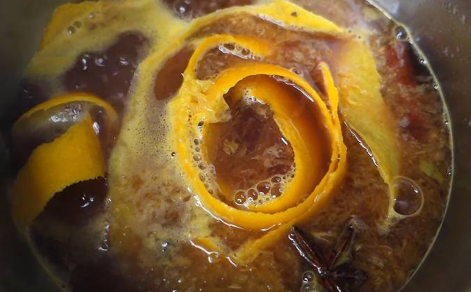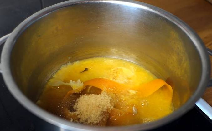 2. И натираем немного мускатного ореха, примерно 1/5 его часть, чтобы дополнить весь этот душистый букет. Варим сироп примерно 10 минут на среднем огне иногда помешивая. Если я готовлю безалкогольный глинтвейн с соком, который уже достаточно сладкий, то я не добавляю сахар дополнительно. Если апельсиново-лимонный сок не покрыл пряности, то я сразу добавляю немного сока в кастрюлю, который подготовила для глинтвейна. Когда 10 минут прошли, вливаем сироп, вино или сок, и хорошо нагреваем всё вместе на среднем огне ещё несколько минут. Незадолго до начала кипения выключите плиту.