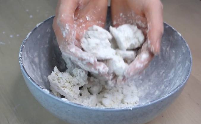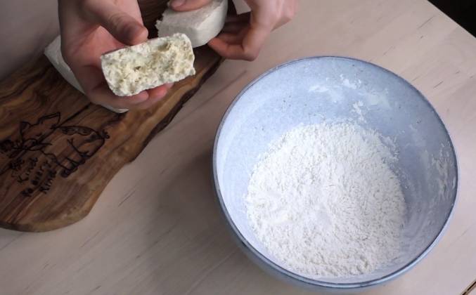 3. Не держите его очень долго под прессом, иначе он станет слишком ломким и не подойдёт для этого рецепта. После разморозки тофу теряет ещё больше жидкости, становится более твёрдым, волокнистым или пористым, в зависимости от производителя, и лучше впитывает в себя маринад. Если при лёгком надавливании на тофу вода не выступает наружу, значит тофу готов к дальнейшей обработке. Подготовим панировку - нам понадобится пшеничная мука и кукурузный крахмал. Всё хорошо перемешиваем в глубокой миске. В это время уже можно поставить сковороду на самый большой огонь и добавить в неё растительное масло на ваш вкус. Пока оно нагревается, тофу нужно разломать на небольшие кусочки и осторожно обвалять в панировке. Я это делаю в два этапа, чтобы панировка полностью покрыла тофу со всех сторон.