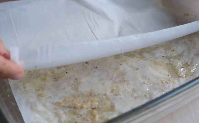 3. Прикладываем форму к листам теста и отмеряем по размеру дна формы несколько больших частей. Прорезаем тесто по отмеченным линиям - только будьте осторожны, листы теста очень тонкие и можно повредить поверхность стола, поэтому лучше что-нибудь подложить под тесто, например доску. Смазываем дно и бортики формы растительным маслом. Кладём лист теста и разравниваем. Затем снова мажем растительным маслом и снова кладём лист. Не следует мазать слишком много масла, чтобы пахлава не получилась очень жирной. Таким образом выкладываем примерно 1/5 часть от общего количества листов теста. Последний листик также смазываем маслом, выкладываем четверть грецких орехов, оставляя немного пустого места, накрываем листиком теста и надавливаем сверху.