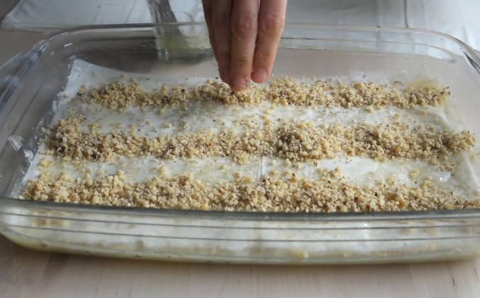 4. В местах, где нет орешков, листики теста скрепятся друг с другом. И в такой последовательности собираем пахлаву, то есть снова 1/5 часть теста смазанную между собой маслом, затем 1/4 часть орешков и так далее. Орехи советую выкладывать на каждом этаже в разных местах, чтобы позже они оказались в каждом кусочке пахлавы. Как я уже говорила, обычно я использую уже готовое тесто фило, что экономит много времени. Покупаю его в турецком магазине. Чаще всего оно без продуктов животного происхождения, но лучше всё же проверить состав перед покупкой. На этом этапе уже можно поставить разогреваться духовку - до 160° на режиме конвекции или 180° на обычном режиме. Самые последние пять листиков я смазываю не маслом, а сиропом, чтобы они склеились между собой и не сильно поднимались во время выпечки.