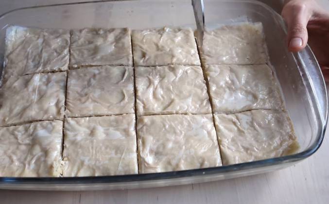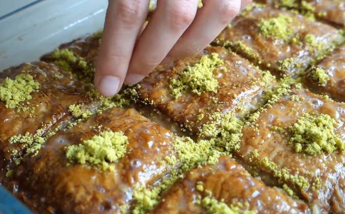 5. Если вам нравится более хрустящая, карамельная корочка, то наружный слой также покройте сверху сиропом. Если наоборот по душе более нежная текстура, то оставьте его сухим. Нарезаем пахлаву на кусочки - в этом видео получились довольно крупные кусочки, но я вам советую делать размером поменьше. Самый оптимальный размер, на мой взгляд, примерно со спичечный коробок - так пахлава хорошо и равномерно пропитается сиропом, и её будет удобнее есть. Недостаточно скреплённые слои я подклеила сиропом. Отправляем пахлаву в духовку примерно на 30 минут. Если она подрумянилась слишком быстро, то спустите её на уровень ниже. Когда пахлава испеклась, сразу заливаем её холодным сиропом. Сначала может показаться, что сиропа слишком много, но он через некоторое время впитается в тесто. Я наклоняю форму в разные стороны, чтобы сироп просочился в каждый уголок и смазываю им верхний слой. Украшаем пахлаву молотыми фисташками или другими орехами, какие вы подготовили, и оставляем пахлаву на час для пропитки.Видео рецепт ютуб ниже 👇