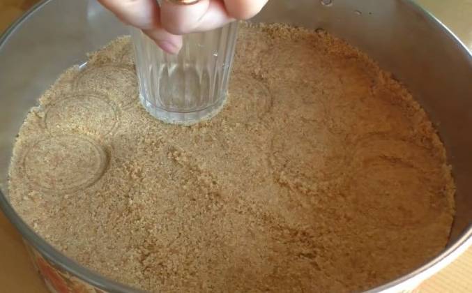 2. Разравниваем и хорошо-хорошо утрамбовываем. Очень удобно трамбовать граненым стаканом. Отправляем основу в холодильник, а мы пока займемся начинкой. 25 граммов желатина заливаем 3-4 ложками холодной кипяченой воды. И отставляем в сторонку. У меня желатин вот такой вот мелкий, он набухнет очень быстро. Вы ориентируйтесь на свой желатин и обязательно прочитайте инструкцию, в ней будет указано, сколько его нужно будет на такой объем. Приготовим крем-брюле. В 60 граммов сахара добавим немного воды. Буквально 15-20 граммов.