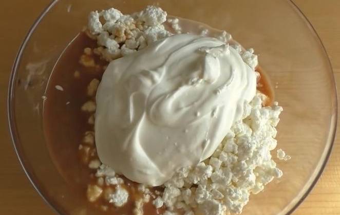 3. И расплавим сахар. Как только карамель стала вот такой вот коричневой и практически прозрачной, добавляем сюда 120 граммов сгущенки. Это треть банки. Перемешиваем и огонь выключаем. Если карамель растворилась неравномерно в сгущенке, то можно еще немножечко прогреть. Берем творог - 600 граммов и добавляем сюда крем-брюле. Добавляем 200 граммов сметаны, у меня она 15%, можно взять даже 20%, будет еще лучше. Ну, если вы считаете калории, то добавляйте даже йогурт. Пробиваем все. Самое время попробовать на сахар.