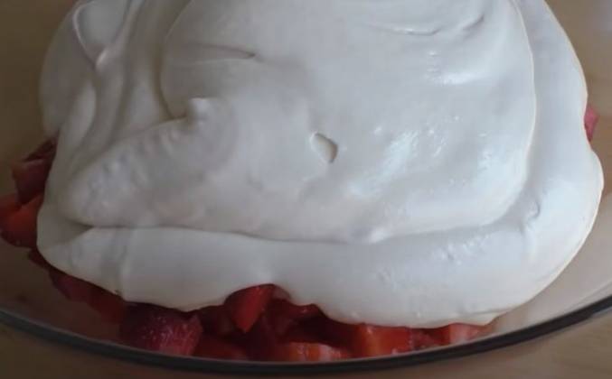 4. Если у вас клубника сладкая, то сахара будет достаточно. Но, а если кислая, то добавляйте сахар по вкусу - прям сюда. И продолжаем взбивать. Когда масса стала однородная, вводим растопленный желатин и сразу же взбиваем. Я растопила желатин на водяной бане. Можно это сделать в микроволновке. Желатин горячий - вводим частями. 400 граммов клубники режем кубиком. Около 150 граммов оставляем еще на украшение. Соединяем клубнику и наш крем крем-брюле. Как он пахнет! Какое все ароматное и вкусное!