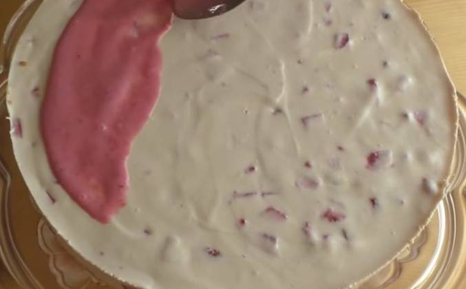 5. И аккуратно перемешиваем, стараясь не помять клубничку. Отправляем начинку на остывший корж. Разравниваем. И будем остужать в холодильнике часа 4. Чтобы он хорошенько застыл. Я выложила торт уже на сервировочное блюдо. Теперь берем несколько клубничек и разминаем их. Процеживаем массу через сито, избавляясь таким образом от косточек. Добавляем сюда где-то столовую ложку сгущенки. Может быть полторы. Вы можете декорировать так, как вам нравится. Я нанесу небольшое количество соуса на одну сторону и на нее буду размещать клубнику.