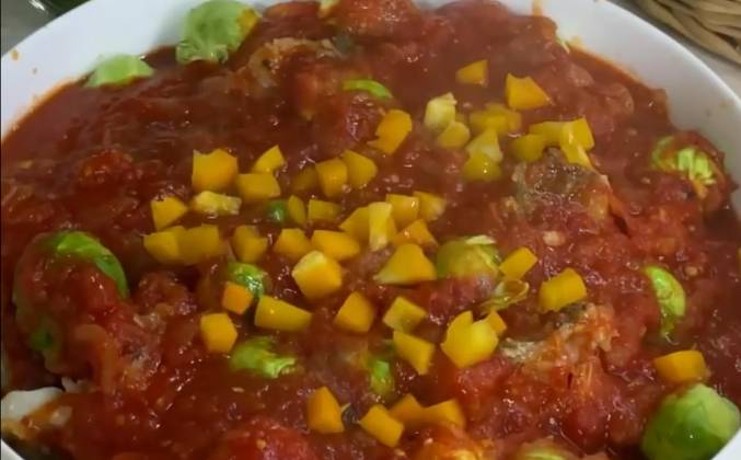 3. Я к рыбе добавила брюссельскую капусту и томатный соус. Посыпаем сладким перцем и лук порей. Накрываем фольгой и ставим в духовку на 25 минут при 180 градусах.