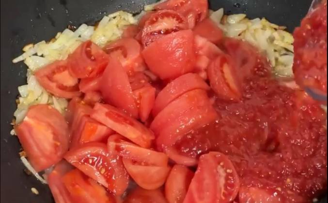 2. Обжариваем лук и добавляем к нему очищенные помидоры и немного томата. Тушим минут 10. По вкусу добавьте соль и сахар. Я не добавляла потому что томат вкусный, уже с солью и сахаром.