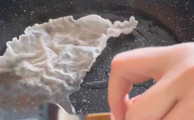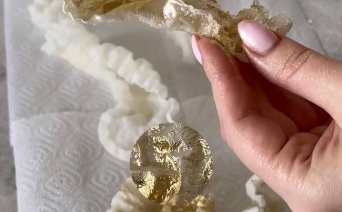 2. Заметила, чем сильнее огонь, тем сильнее закручиваемся бумага. Можете поиграть с температурой. Сразу же снимаем с огня, кладём на бумажное полотенце, чтобы убрать излишки масла. Очень эффектно смотрится, если покрыть золотым кандурином.