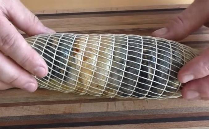 4. Если используете пищевую пленку, наматывайте, не жалея, чтобы вода не попадала. А я еще возьму вот так и затяну рулет в сетку. Чтобы моя коллагеновая пленка прилегала поплотнее. Полученный рулет отправляем в кастрюлю. Заливаем холодной водой и варим после закипания ровно 20 минут. И главное - хорошо остудить рулет в холодильнике. Мой пролежал три часа. Вот так вот уплотнился. И сейчас я его нарежу и покажу вам. Отлично режется.Видео рецепт ютуб ниже 👇