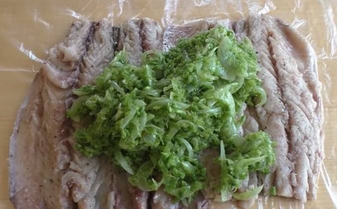 2. С рыбой закончили, теперь займемся овощами. Лучок нарезаем перьями. И обжариваем в небольшом количестве масла. В это же время чесночные стрелки пропускаем через мясорубку. И как только лучок немного зазолотится, добавляем чесночные стрелки перекрученные. Немного, буквально щепотку соли. Помним, что рыбу мы тоже будем солить. Хорошо перемешиваем и прогреваем. По времени - это вот буквально минутка-две. После чего остужаем начинку. Все, кроме желатина смешиваем вместе - перец с сахаром и соль. Перемешали. И равномерно присыпаем, присаливаем нашу скумбрию.