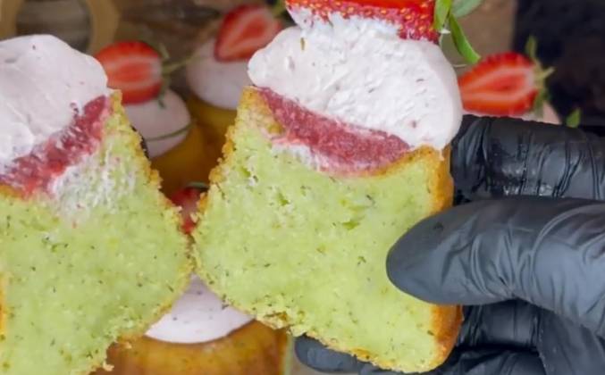 Кекс с клубничным кули, кремом и базиликом