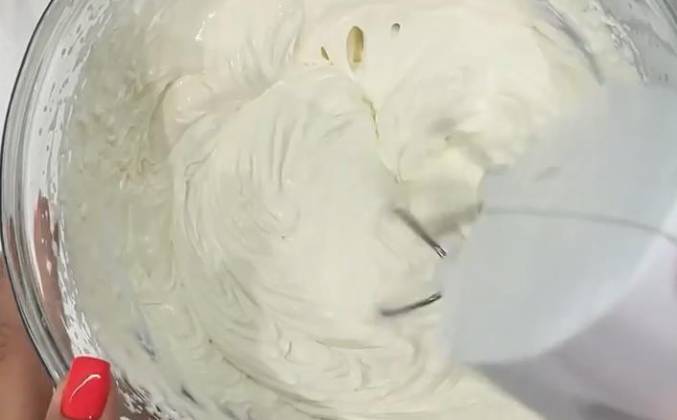 4. Готовим крем: соединяем холодные жирные сливки с сахарной пудрой и творожным сыром и взбиваем до гладкости миксером 2-3 мин, консистенция на видео. Собираем: остывший бисквит разворачиваем, пропитываем сиропом вишни (не переборщите, чтоб сильно не размок, пусть лучше останется).