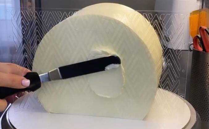 2. Подрезаем дно торта ножом или длинной спатулой и быстренько переворачиваем торт на другую подложку. На эту же я не ставлю, так как она вся в крошках и остатках крема. Заднюю поверхность выравниваем кремом. Прикладываем трафарет на охлаждённый тортик, наносим тёплый крем (тот же, что и на покрытии), убираем трафарет.