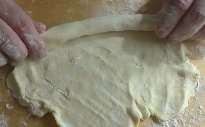 3. Теперь эту улитку заворачиваем в плёнку и убираем до использования минимум на полчасика. Масло должно еще раз застыть. В холодильник. Если не учитывать время для застывания теста, то готовится оно буквально 5 минут. Теперь можно швом вниз и раскатываем. Для выпечки лучше не придумаешь. Самое быстрое слоеное тесто, которое вы только могли себе представить. Сейчас, друзья, покажу, что же с него получится - слойки с яблоками.Видео рецепт ютуб ниже 👇