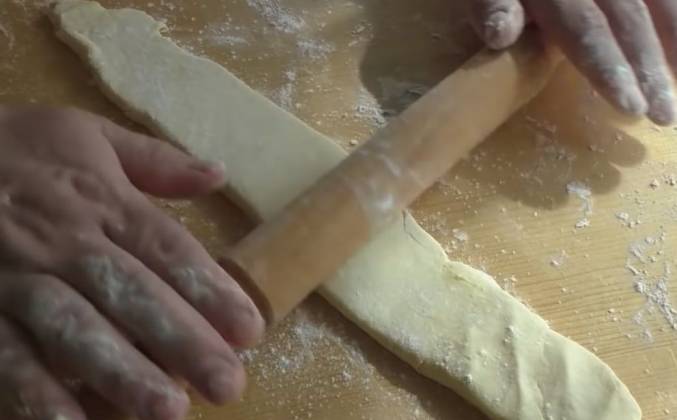 2. Стол припыляем мукой. Вот такое тесто получается по консистенции. Достаем все на стол, сверху добавляем еще муки и теперь формируем, и с помощью скалки раскатываем прямоугольник. Вот такой пласт у меня получился. Толщиной 2-3 миллиметра. Теперь с этой стороны начинаем сворачивать плотный такой вот рулетик. Еще раз вот так вот расплющиваем. Выровняли, немного припылили, подкатали слегка. И заворачиваем с этой стороны - плотненько вот такую улиточку.