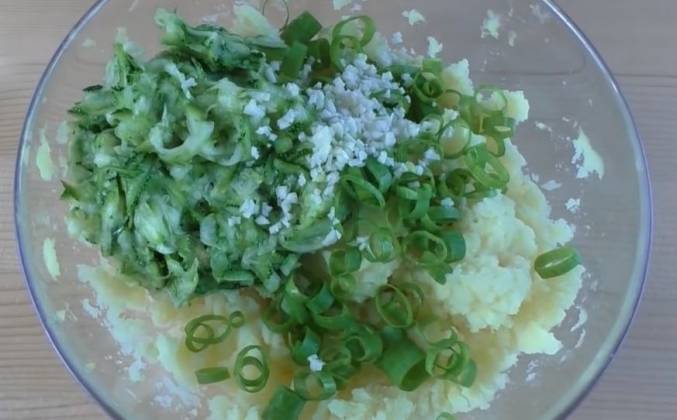 2. Добавляем пол чайной ложки соли, перемешиваем и даем постоять минут 15-20. Нам нужно избавиться от лишней влаги. Кабачки хорошо отжимаем и добавляем к картофельному пюре. Вот представьте, с одного кабачка осталось не так уж и много. Но кабачок добавит нам свежести и сочности. Сюда же добавим пару столовых ложек зеленого лука, 2 зубчика чеснока, я его мелко порезала. Добавляем 200 граммов сыра. У меня моцарелла белорусская. Одно яйцо, соль. Картофель я, когда отваривала, тоже добавляла соль.